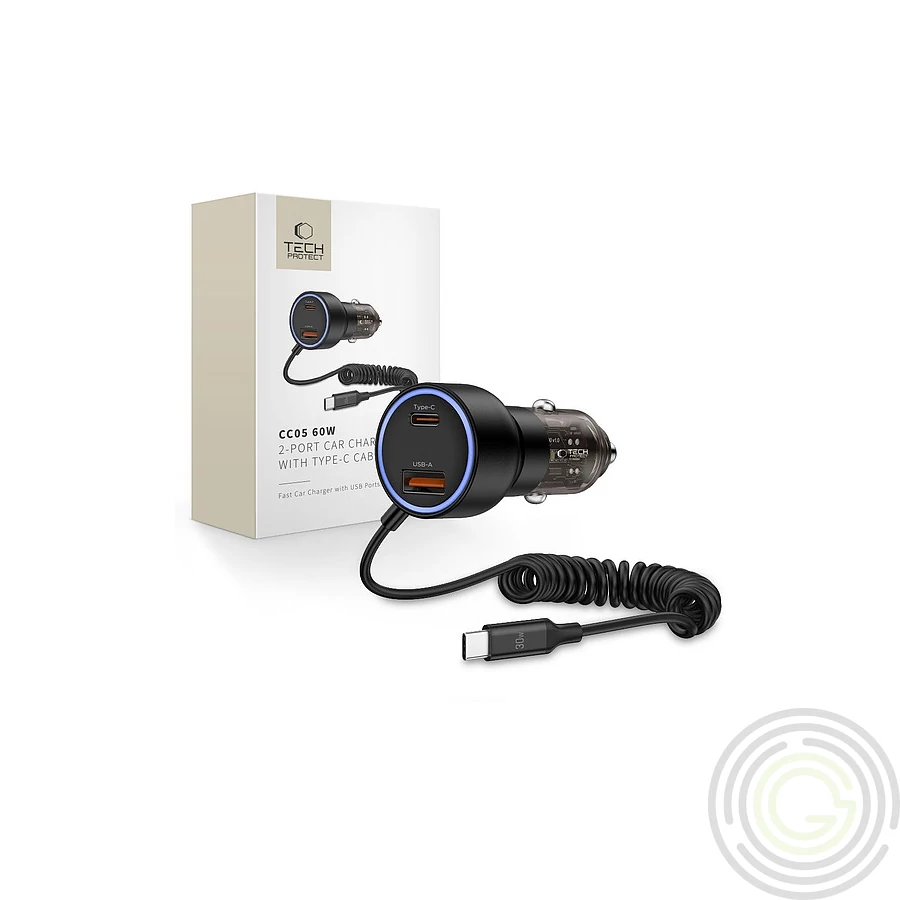 CC05 Autós Töltő 2 Portos PD60 W + USB-C Kábel - Fekete