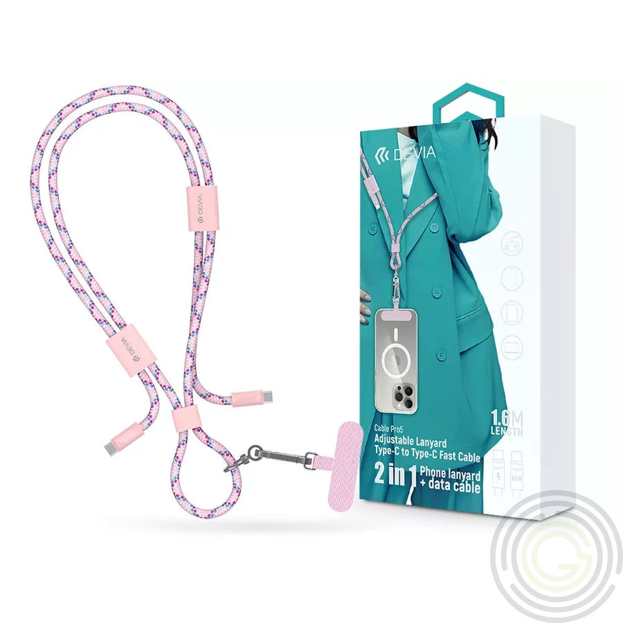 Devia Cable Pro5 Woven 60W PD Type-C/Type-C adat- és töltőkábel + nyakpánt 1,6m pink